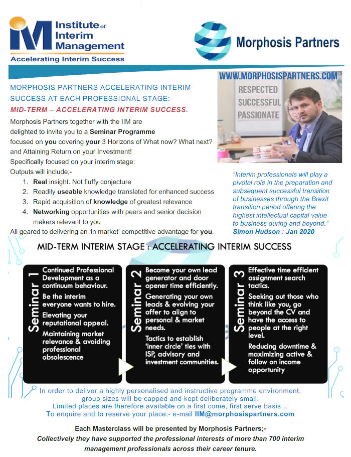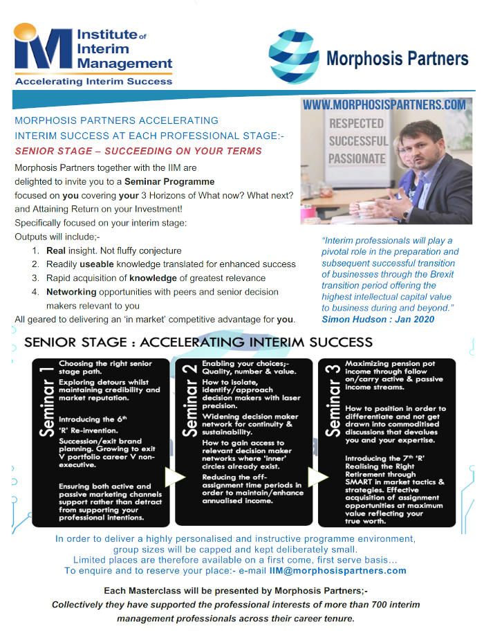 Succeeding on your terms - Morphosis Partners together with the IIM are delighted to invite you to a series of Masterclass Seminars specifically focused on your interim stage: Early, Mid and Senior - focused on you covering your 3 Horizons of What now? What next? and attaining Return on your Investment! All geared to delivering an ‘in market’ competitive advantage for you.